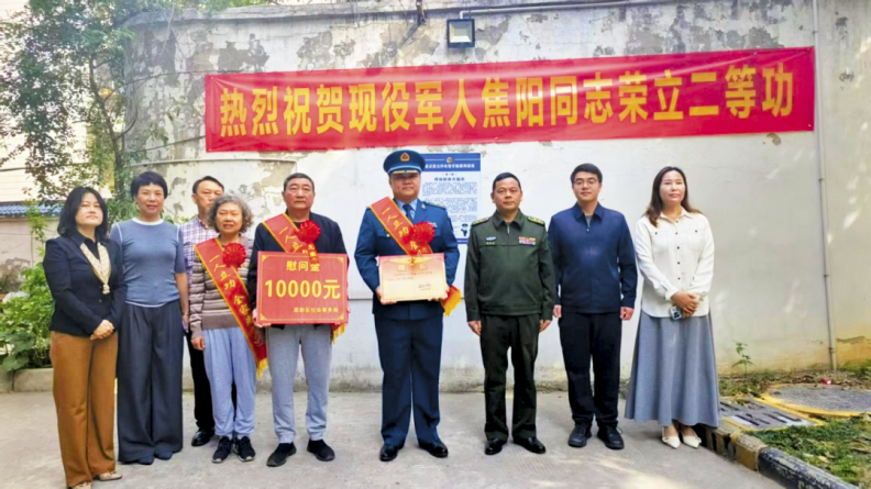 “咚咚锵,咚咚锵……”前不久,樊城区紫贞街道长虹盛景小区锣鼓喧天、热闹非凡,军地工作人员联合将二等功喜报及慰问金送到现役军人焦阳的家中,胸戴大红花、身披红绶带的焦阳家人脸上洋溢着喜悦和自豪。